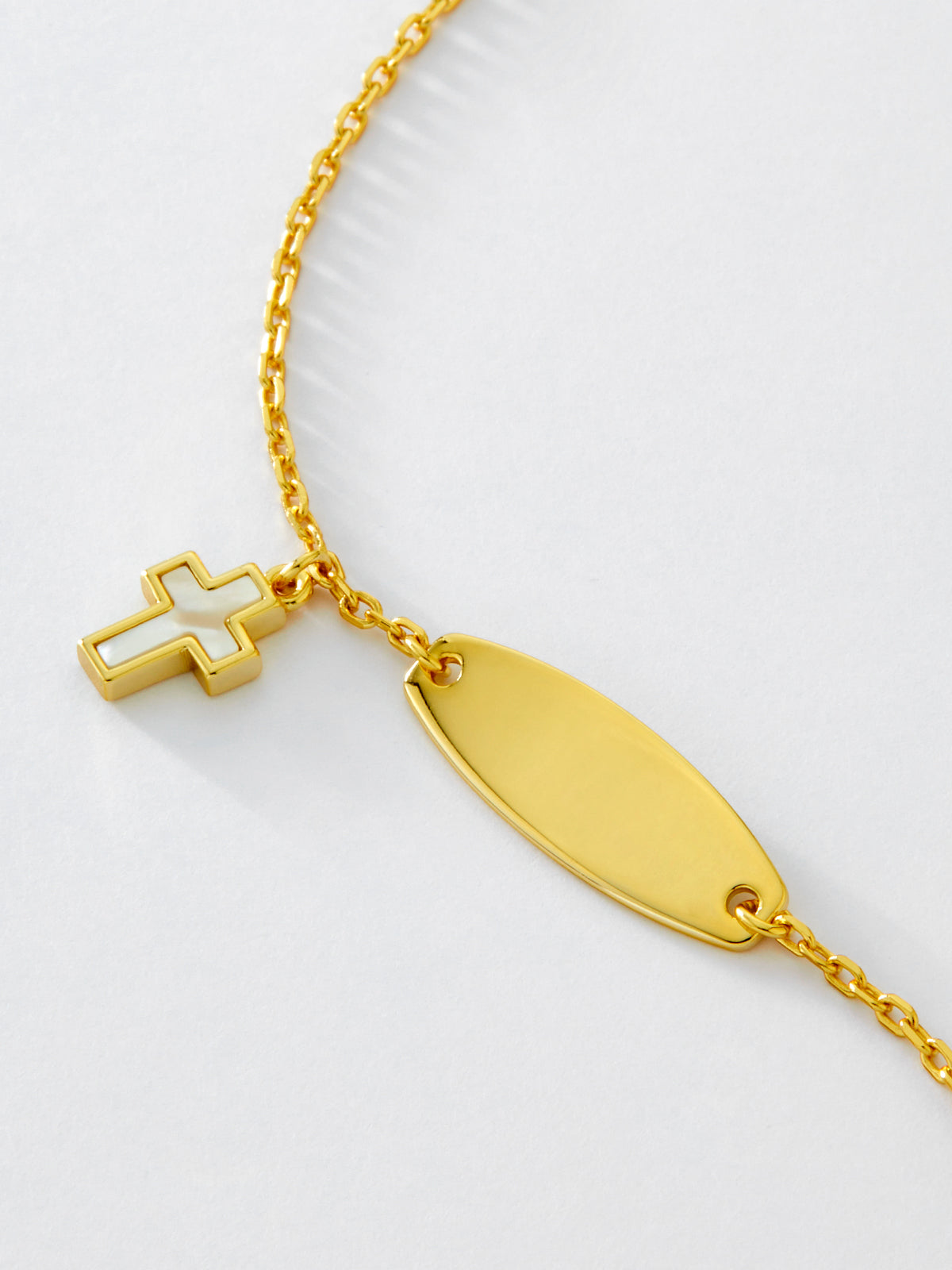 Pulsera plaquita cruz nácar. Plata de 1ª Ley baño en oro de 18k. Placa grabable. Cierre reasa. Cadena adaptable.